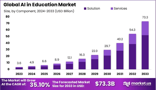 A reliable research firm has predicted that the growth of AI in education/eLearning industry will surpass 73 billion by the year 2033. This report has expected the growth of AI in this sector at over 35 percent CAGR through the period of 2023 to 2033. Let’s dig deep into the drivers or trends that will help AI grow at this rate.