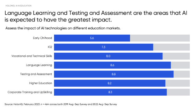 AI has a vital role to play in education IT solutions. As per the following graph, language learning and assessment are the key areas where AI can have the biggest impact. Moreover, this technology has influence on giving vocational skills and corporate training.