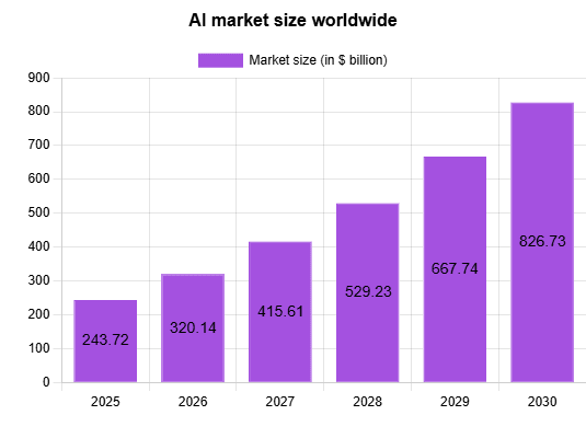Artificial intelligence has become part of our personal and professional lives. AI technology is gaining fame in the corporate world, and as per the Statista survey, the global AI market is expected to be worth over USD 800 billion by the end of 2030. The following graph shows the global AI market projection from 2025 to 2030.