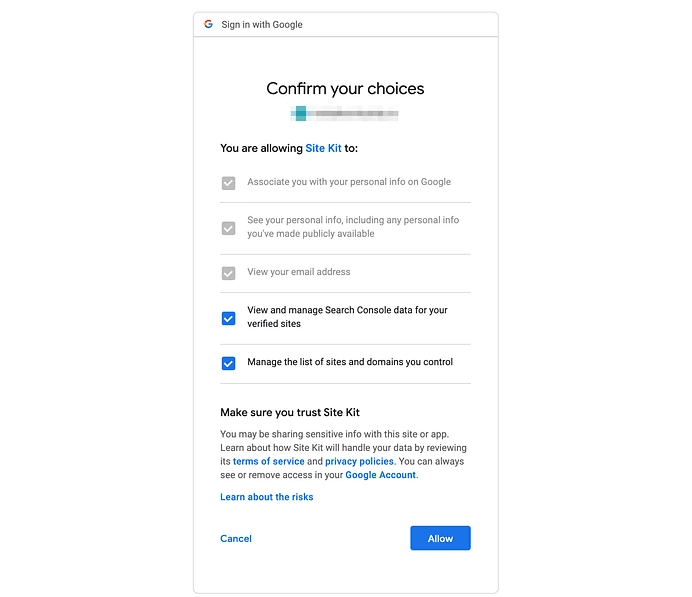 For every additional service, you wish to include, you will have to confirm the account that you plan to use for it, and for Site Kit, authorize a list of permissions. If you need, have new tools on your site just by choosing from the dashboard: