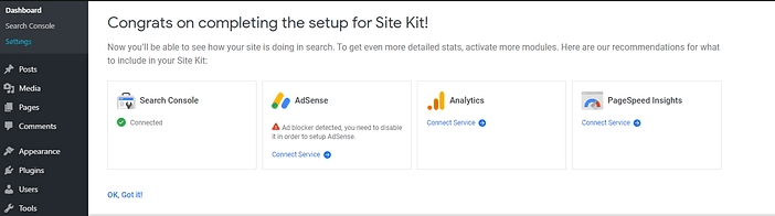 You need to integrate Search Console with WordPress for Google Site Kit but, you will get to customize the services that you want to be included once you have completed the setup wizard. The plugin offers you links to connect Analytics, AdSense, and PageSpeed Insights: