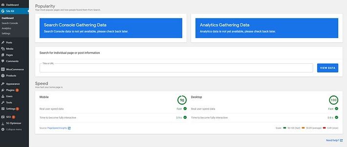 For services like Google Analytics and Search Console, Site Kit needs to collect some data so as to show some results. Here is an example of how the dashboard displays results when PageSpeed Insights is connected: