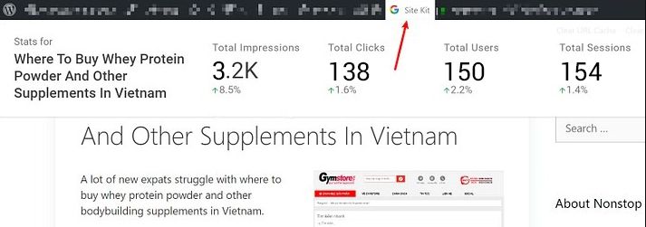 You also get to filter based on specific pages on your website and it can be like showing statistics for testing a said page speed or a certain blog post. The WordPress toolbar will also offer you the option of a new Site Kit. The option can be viewed on the frontend of your website and here you will get to see statistics of Google Analytics for the specific content you are currently checking: