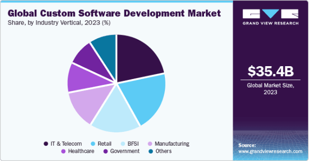 As per the report from Grand View Research, the global software development market has reached USD 35.4 billion by 2023. The following graph shows sector-wise share in the global market.