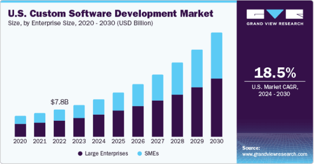 As per the Grand View Research prediction, the custom software development market in the USA will grow at a steady CAGR of 18.5 percent between the period of 2024-2030. Both large enterprises and SMEs will contribute in increasing the market share of custom software development. It shows the importance of tailored business software.