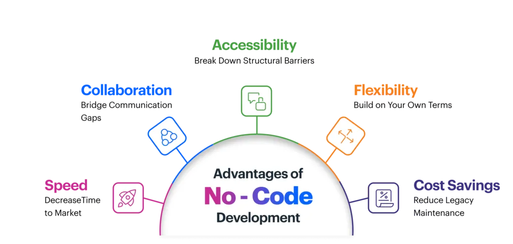 No-code development, requiring minimal coding, empowers non-technical users with drag-and-drop functionality and pre-built templates.