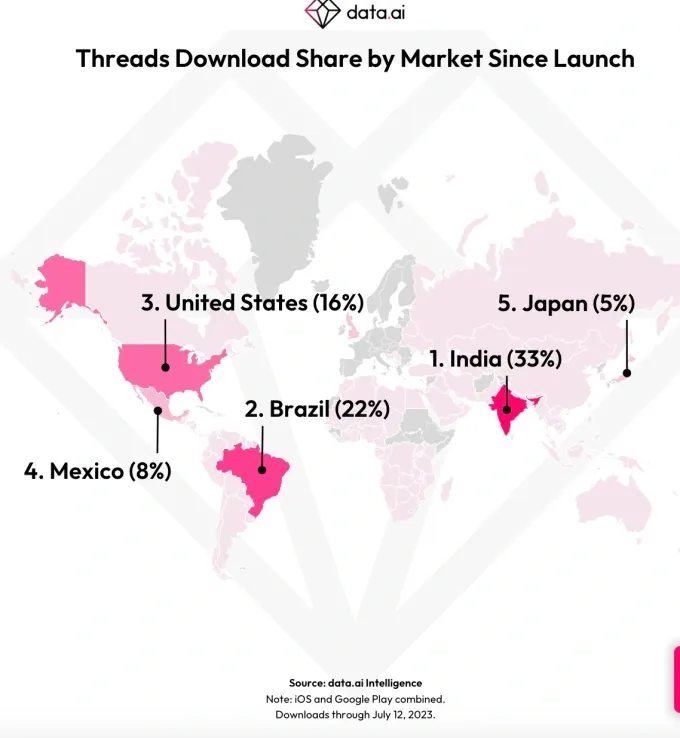 Threads is the epitome of what we call an overnight success. New statistics are more surprising. It says Threads has already gained one-fifth of the weekly active users of Twitter across the world and 86 times the weekly active users of the largest American rival of Twitter, Truth Social. What’s more, the momentum for Threads is far from over. Can we consider Threads as the biggest competitor of Twitter now, or do you want more proof? Here is a Data.ai report on Thread’s global market share since launch.